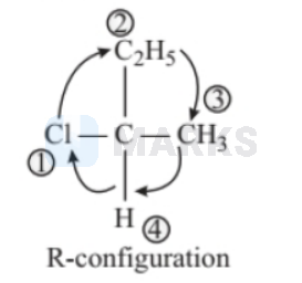 R-configuration indicates that a clockwise circular arrow goes from higher priority to lower priority and that lowest-priority substituent is in the back.