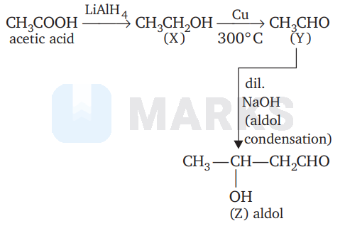 $\mathrm{CH}_{3} \mathrm{COOH} \stackrel{\mathrm{LiAlH}_{4}}{\longrightarrow} \mathrm{X} \underset{300^{\circ} \mathrm{C}}{\stackrel{\mathrm{Cu}}{\longrightarrow}} \mathrm{Y} \underset{\mathrm{NaOH}}{\stackrel{\text { Dilute }}{\longrightarrow}} \mathrm{Z}$