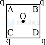 Charges are placed at the vertices of a square as shown in the diagram. If charges at and are interchanged with and respectively, then,