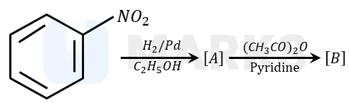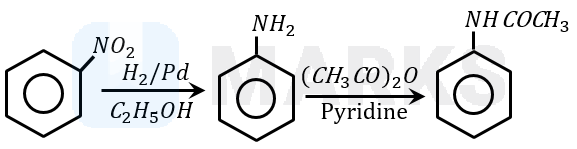 Nitrobenzene is reduced to aniline by passing hydrogen gas in presence of finely divided palladium and also by reduction with metals in an acidic medium. When aniline reacts with acetic anhydride in the presence of pyridine to give acetanilide. Aniline acts as a weak base, while acetic anhydride acts as electrophile.