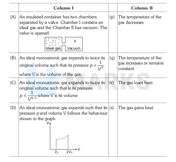Column I contains a list of processes involving expansion of an ideal gas. Match this with Column II describing the thermodynamic change during this process. Indicate your answer by darkening the appropriate bubbles of the $4 \times 4$ matrix given in the ORS.