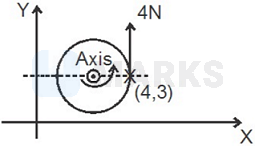 Consider a uniform disc in the x-y plane free to rotate about an axis parallel to the Z-axis as shown (passing through the centre). A force of 4N applied at along y-axis, as shown produces an angular acceleration of . Locate the centre of mass of the disc if the mass of the disc is 2 kg.