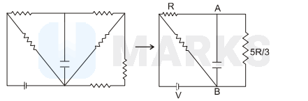 $V_{A B}=\frac{5 \frac{R}{3}}{\frac{5 R}{3}+R} \times V=\frac{5}{8} V$