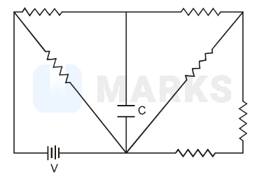 All the resistors are identical. The charge stored in the capacitor, once it is fully charged, is
