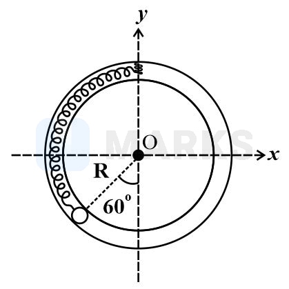 Consider the figure here. A particle of mass is constrained to move inside a smooth vertical groove of radius and is connected to a light spring of spring constant in equilibrium. is centre of the groove. and are horizontal and vertical axes respectively. Different physical parameters are related as . Angular frequency of the oscillations, if the particle is slightly displaced from the shown equilibrium position is