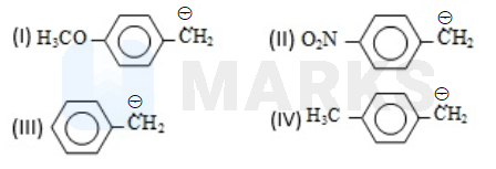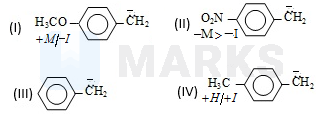 In (II), stability is increased as there is an electron withdrawing group, hence it stabilizes, but in (I) and (IV), it increases the electron density whereas in (III), there is no functional group attached for electron donation or withdrawal.
