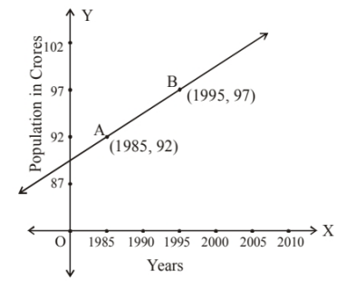Consider the following population and year graph, find the slope of the line $A B$ and using it, find what will be the population in the year 2010 ?