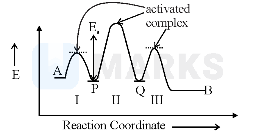 The curve contain three activated complex as shown below in the curve.In the curve P and Q are the intermediates. The step with the highest activation energy is the rate determining step. Hence, in the given reaction, two intermediates, three activated complexes are involved and step-II is the rate determining step.
