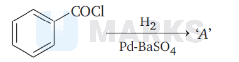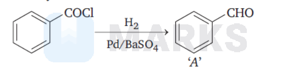 In Rosenmund reaction, acid chloride reacts with $\mathrm{H}_2$ in the presence of $\mathrm{Pd} / \mathrm{BaSO}_4$ to yield aldehyde.