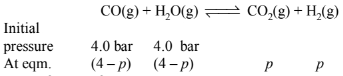 If a reaction vessel at \(400^{\circ} \mathrm{C}\) is charged with an equimolar mixture of \(\mathrm{CO}\) and steam such that \(\mathrm{p}_{\mathrm{CO}}=\mathrm{P}_{\mathrm{H}_2 \mathrm{O}}=\mathbf{4 . 0}\) bar, what will be the partial pressure of \(\mathrm{H}_2\) at equilibrium ?