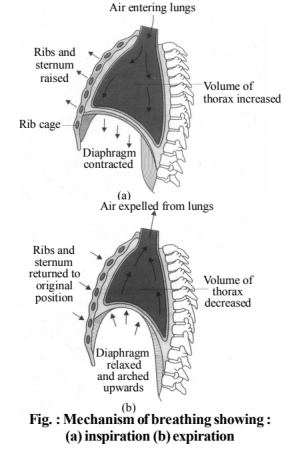 The movement of air into and out ofa the lungs is carried out by creating a pressure gradient between the lungs and the atmosphere, with the help of diaphragm and inter costal muscles.