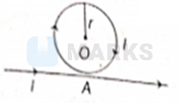 Figure show the circular coil carrying current kept very close but not touching at a point A on a straight conductor carrying the same current . The magnitude of magnetic induction at the centre of the circular coil will be