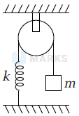 Figure shows spring + block + pulley system which are light. The time period of mass would be