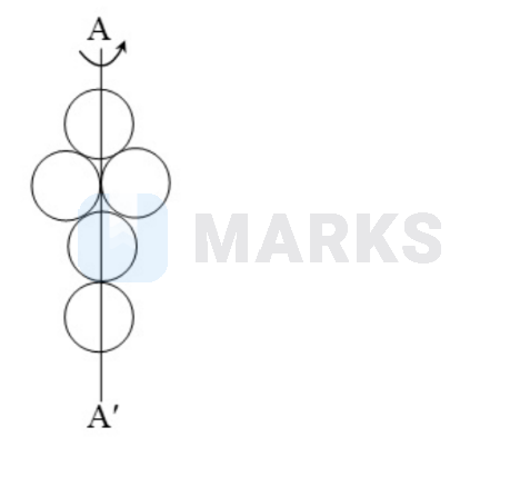 Five solid spheres each of mass $m$ and radius $r$ are rotating about an axis $A$ as shown in figure. Hence the moment of inertia of the system about the axis of rotation A-A' as shown in figure. Hence the moment of inertia of the system about the axis of rotation A-A' is
