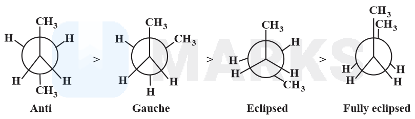 Out of these conformations of n- butane the conformation (3) that is ‘Anti’ is the most stable one as in it same atoms or groups are present at maximum distance (opposite or at 180o). The stability order can be given as follows