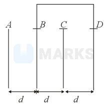 Four identical rectangular plates with length, and breadth, are arranged as shown in figure. The equivalent capacitance between and is The value of is _______.