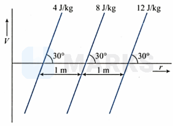Gravitational potential \( V \) versus distance \( r \) graph is represented in figure. The magnitude of gravitational field intensity is