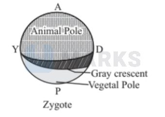 In the zygote of the frog, there are two poles present. The vegetal pole and the animal pole. These are separated by an area which is rich in melanin and is known as the grey crescent. The egg enters enter opposite to the region of sperm entry. The broadest part of the grey crescent forms the dorsal end. The grey crescent helps in establishing polarity.