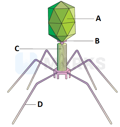 Identify A, B, C and D parts in this diagram of bacteriophage.