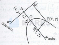 $\because \quad$ Vertex $\mathrm{O} \equiv(2,3)$ focus $\mathrm{S} \equiv(3,2)$ $\because \mathrm{O}$ is the mid point AS $\therefore \frac{\mathrm{x}_1+3}{2}=2$ and $\frac{\mathrm{y}_1+2}{2}=3$
