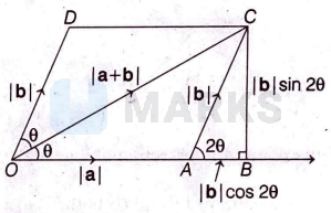 $\begin{aligned} & \text { In } \triangle A B C, A B=|\mathbf{b}| \cos 2 \theta \\ & \text { and } B C=|\mathbf{b}| \sin 2 \theta \\ & \text { In } \triangle O B C \text {, }\end{aligned}$