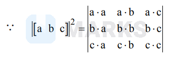 $=\left|\begin{array}{ccc}|\mathrm{a}|^2 & 0 & 0 \\ 0 & |\mathrm{~b}|^2 & 0 \\ 0 & 0 & |\mathrm{c}|^2\end{array}\right| \quad[\because \mathrm{a} \cdot \mathrm{a}=|\mathrm{a}|]$