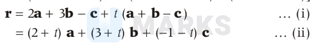 & =(2 \mathbf{a}+3 \mathbf{b}-\mathbf{c})+t(3 \mathbf{a}+4 \mathbf{b}-2 \mathbf{c})-(2 \mathbf{a}+3 \mathbf{b}-\mathbf{c})]