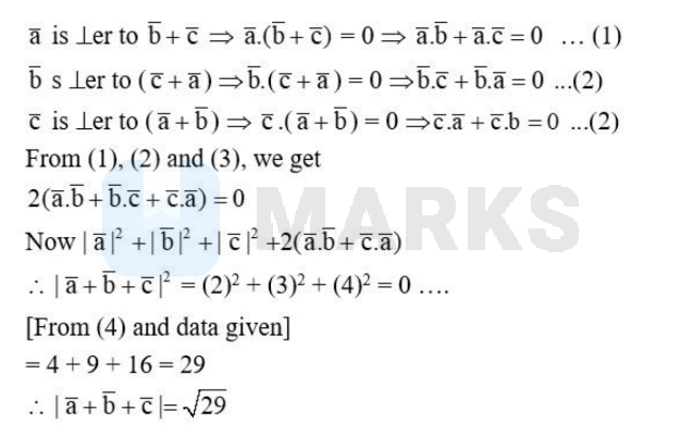 If $\bar{a}, \bar{b}, \bar{c}$ are three vectors which are perpendicular to $\overline{\mathrm{b}}+\overline{\mathrm{c}}, \overline{\mathrm{c}}+\overline{\mathrm{a}}$, and $\overline{\mathrm{a}}+\overline{\mathrm{b}}$ respectively, such that $|\overline{\mathrm{a}}|=2|\overline{\mathrm{b}}|=3,|\overline{\mathrm{c}}|=4$, then $|\overline{\mathrm{a}}+\overline{\mathrm{b}}+\overline{\mathrm{c}}|=$