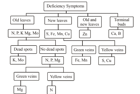 The region of appearance of deficiency symptoms depends on mobility of nutrient in plants. The nutrient deficiency symptoms of $\mathrm{N}, \mathrm{P}, \mathrm{K}, \mathrm{Mg}$ and Mo appear in lower leaves. Zinc is moderately mobile in plants and deficiency symptoms, therefore, appear in middle leaves. The deficiency symptoms of less mobile elements ( $\mathrm{S}, \mathrm{Fe}$, $\mathrm{Mn}$ and $\mathrm{Cu}$ ) appear on new leaves.