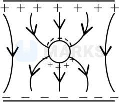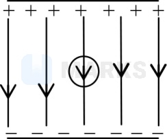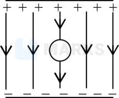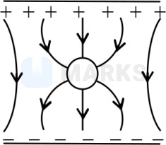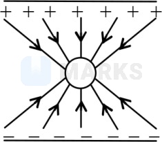 If an uncharged sphere of metal is placed in the uniform electric field produced by two large oppositely charged plates, then the lines of force will look like