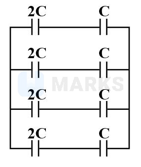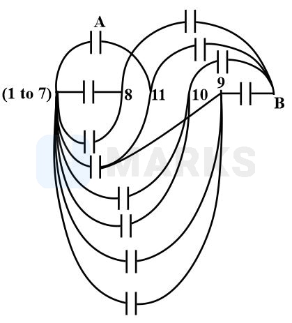 If each capacitor has capacitance , then equivalent capacitance between and is
