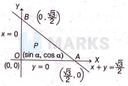 If $P(\sin \alpha, \cos \alpha)$ lies inside the triangle formed by the vertices $(0,0),\left(\sqrt{\frac{3}{2}}, 0\right)$ and $\left(0, \sqrt{\frac{3}{2}}\right)$, then $\alpha$ lies in the interval