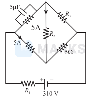 \mathrm{V}_{\text {capacitor }}=\frac{Q}{C}=\frac{1 \times 10^{-3}}{5 \times 10^{-6}}=\frac{1000}{5}=200 \mathrm{~V}