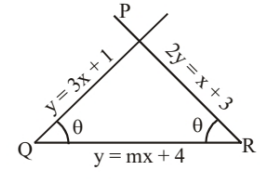 Slope of the line $P R: 2 y=x+3$ is $\frac{1}{2}$ and slope of $Q R$ is $m$ The angle between $P R$ and $Q R$ is given by