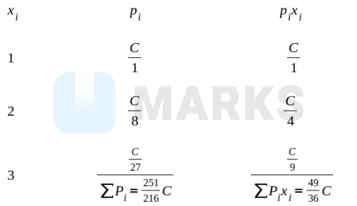 $\begin{aligned} & \because \sum P_i=1 \\ & \Rightarrow \frac{251}{216} C \\ & \Rightarrow C=\frac{216}{251} \\ & \text { now } E(x)=\sum p_i x_i=\frac{49}{36} C=\frac{49}{36} \times \frac{216}{251}=\frac{294}{251}\end{aligned}$