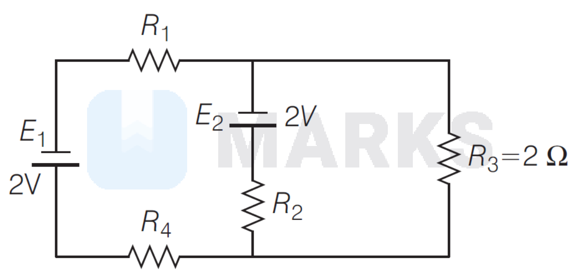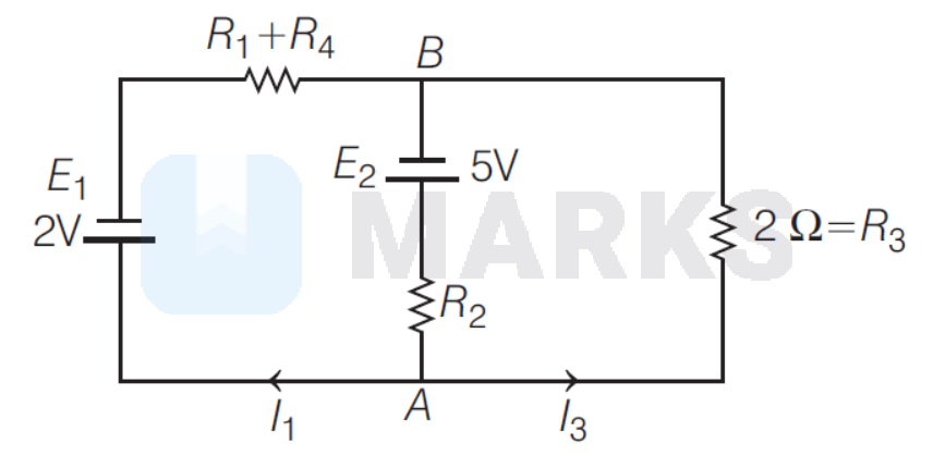 As given, $I_1=0 \mathrm{~A}$, so the potential drop of $2 \mathrm{~V}$ takes place across the parallel branch $\mathrm{AB}$ and resistor $R_3$.