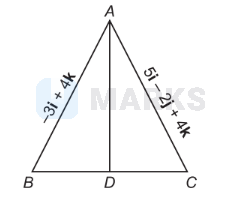 $\begin{aligned} & =\frac{1(-3 \mathbf{i}+4 \mathbf{k})+1(5 \mathbf{i}-2 \mathbf{j}+4 \mathbf{k})}{1+1} \\ & =\mathbf{i}-\mathbf{j}+4 \mathbf{k} \\ & \therefore|\mathrm{AD}|=\sqrt{1+1+16}=\sqrt{18}\end{aligned}$