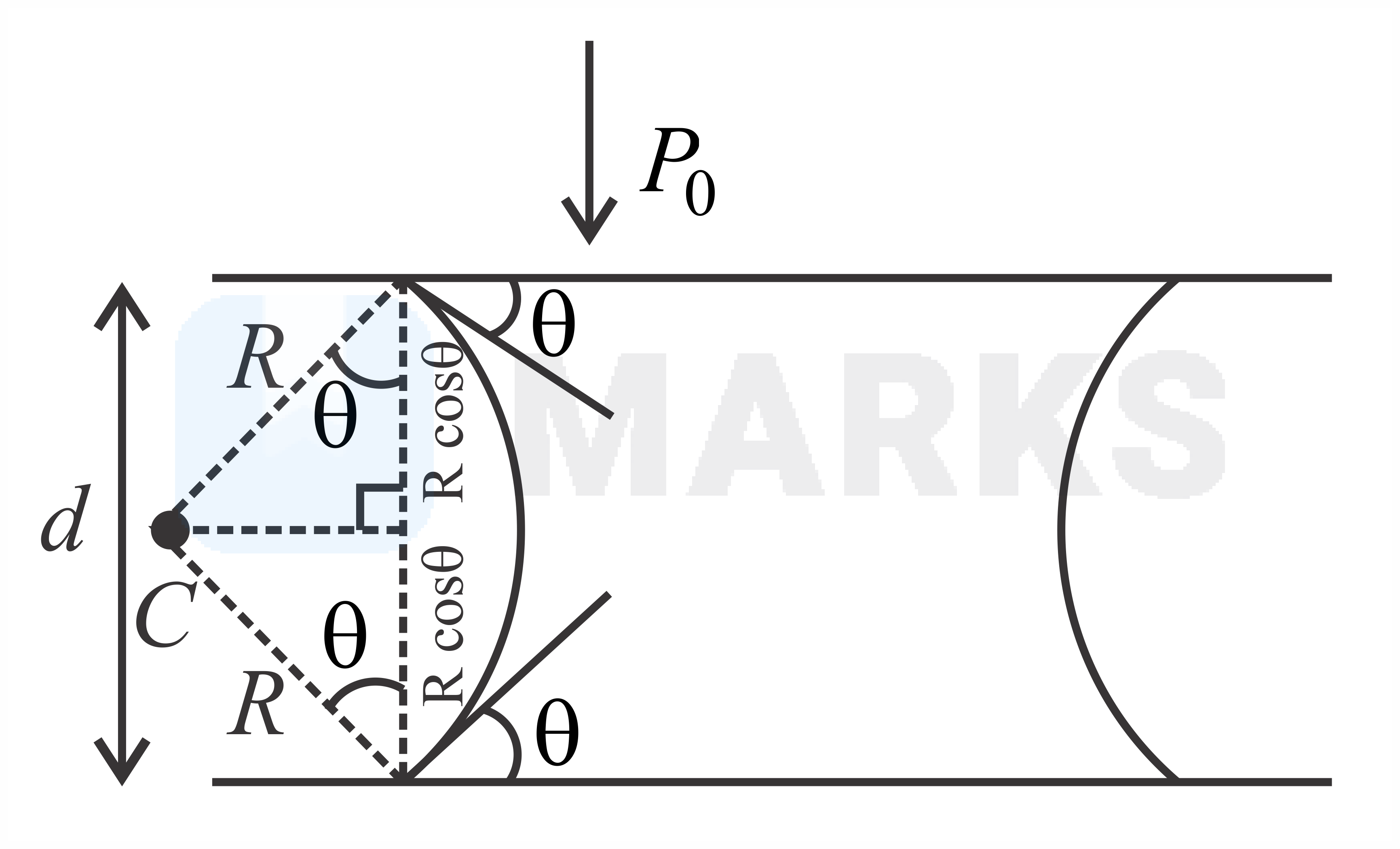 If two glass plates have water between them and are separated by very small distance (see figure), it is very difficult to pull them apart. It is because the water in between forms cylindrical surface on the side that gives rise to lower pressure in the water in comparison to atmosphere. If the radius of the cylindrical surface is R and surface tension of water is T then the pressure in water between the plates is lower by: