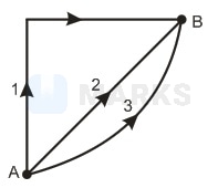 If , and represent the work done in moving a particle from to along three different paths , and respectively (as shown) in the gravitational field of a point mass . Find the correct relation between , and .