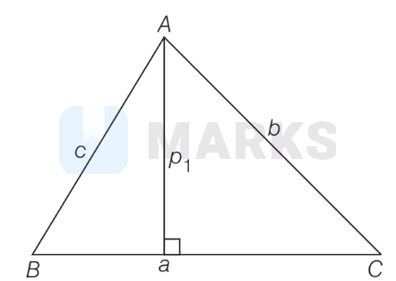 $\begin{aligned} & \Delta=\frac{1}{2} \cdot a \cdot p_1 \\ & \Rightarrow \quad p_1=\frac{2 \Delta}{a} \Rightarrow \frac{1}{p_1}=\frac{a}{2 \Delta} \\ & p_2=\frac{2 \Delta}{b} \Rightarrow \frac{1}{p_2}=\frac{b}{2 \Delta} \\ & p_3=\frac{2 \Delta}{c} \Rightarrow \frac{1}{p_3}=\frac{c}{2 \Delta}\end{aligned}$