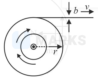 In a continuous printing process, paper roll is wrapped on a cylindrical core which is free to rotate about a fixed horizontal axis. The paper is drawn into the process at a constant speed , as shown in the figure. If is the radius of paper on the roll at any given time and is the thickness of the paper, then the angular acceleration of the roll at this instant is
