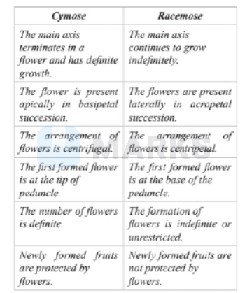 In the cymose type of inflorescence, the main axis does not grow continuously. A flower is present terminally on the main axis. The flowers are borne in a basipetal order. The main axis has limited growth. The growth of the main axis is limited and the lateral axis also terminates into flower and that limits the growth of the axis. Flowers are present in the basipetal succession, i.e. older flower is present terminally and the younger ones at the base. This type of arrangement is known as centrifugal with the older flowers present in the middle and the younger ones at the periphery. In racemose types of inflorescence, the main axis grows continuously and flowers are present laterally on the floral axis. Flowers are present in an acropetal manner.