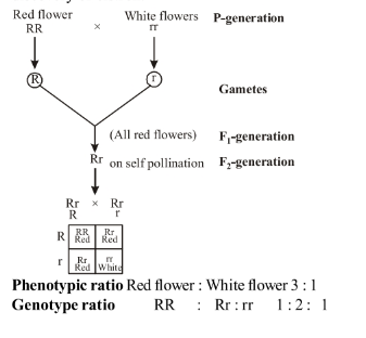 In a monohybrid cross of plants with red and white flowered plants. Mendel got only red flowered plants. On self-pollination these $F_1$ plants got both red and white flowered plants in $3: 1$ ratio. Explain the basis of using RR and rr symbols to represent the genotype of plants of parental generation.