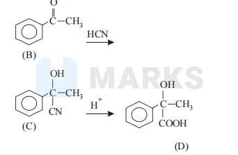 \mathrm{CH}_{3} \mathrm{COOH} \stackrel{\mathrm{SOCl}_{2}}{\longrightarrow} \mathrm{A} \stackrel{\text { Berzene }}{\text { anhy. AlCl }_{3}} \mathrm{~B} \stackrel{\text { HCN }}{\longrightarrow}\mathrm{C} \stackrel{\mathrm{H}_{2} \mathrm{O}}{\longrightarrow} \mathrm{D}
