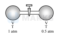 In a thermally isolated system, two boxes filled with an ideal gas are connected by a valve. When the valve is in closed position, states of the box 1 and 2 , respectively, are (1 atm, V, T) and (0.5 atm, $4 \mathrm{~V}, \mathrm{~T}$ ). When the valve is opened, the final pressure of the system is approximately
