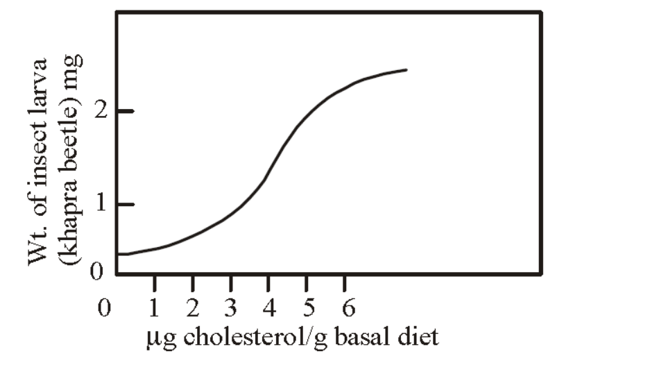 In an experiment freshly hatched larvae of an insect (Khapra beetle) were reared on a basal diet (complete diet without cholesterol) with increasing amounts of cholesterol. Results obtained are shown in the graph given in the table : The graph indicates that