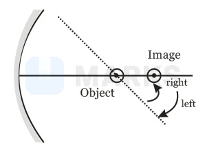 In an experiment to determine the focal length of a concave mirror by the method, a student places the object pin on the principal axis at a distance from the pole . The student looks at the pin and its inverted image from a distance keeping his/her eye in line with . When the student shifts his/her eye towards left, the image appears to the right of the object pin. Then
