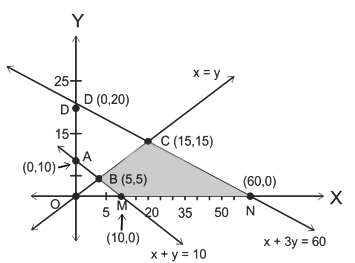 $\begin{array}{|c|l|} \hline \text{Corner Points of feasible region} & z \\ \hline C(15,15) & 6 \\ \hline B(5,5) & 0 \\ \hline M(10,0) & 2 \\ \hline N(60,0) & 0 \\ \hline \end{array}$