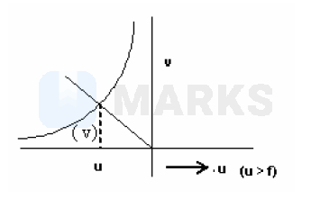 In an optics experiment, with the position of the object fixed, a student varies the position of a convex lens and for each position, the screen is adjusted to get a clear image of the object. A graph between the object distance $u$ and the image distance $v$, from the lens, is plotted using the same scale for the two axes. A straight line passing through the origin and making an angle of $45^{\circ}$ with the x-axis meets the experimental curve at $P$. The coordinates of $P$ will be