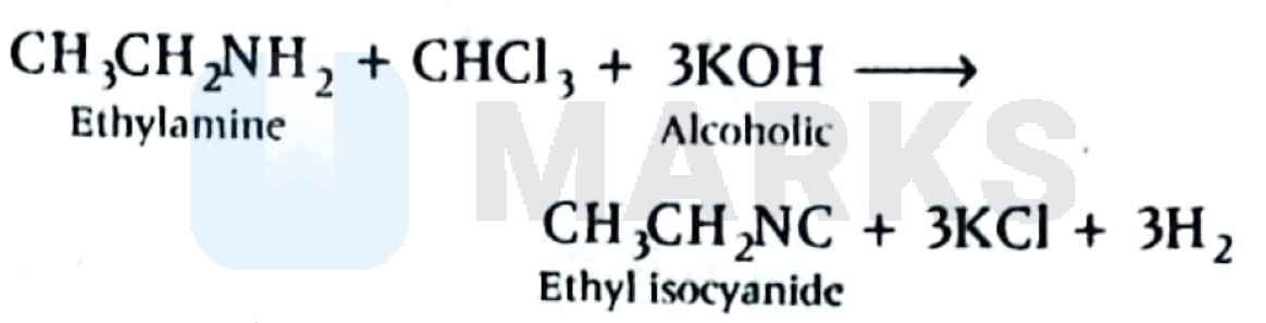 In carbylamine test for primary amines the resulting foul smelling product is $\mathrm{CH}_3 \mathrm{NC}$.